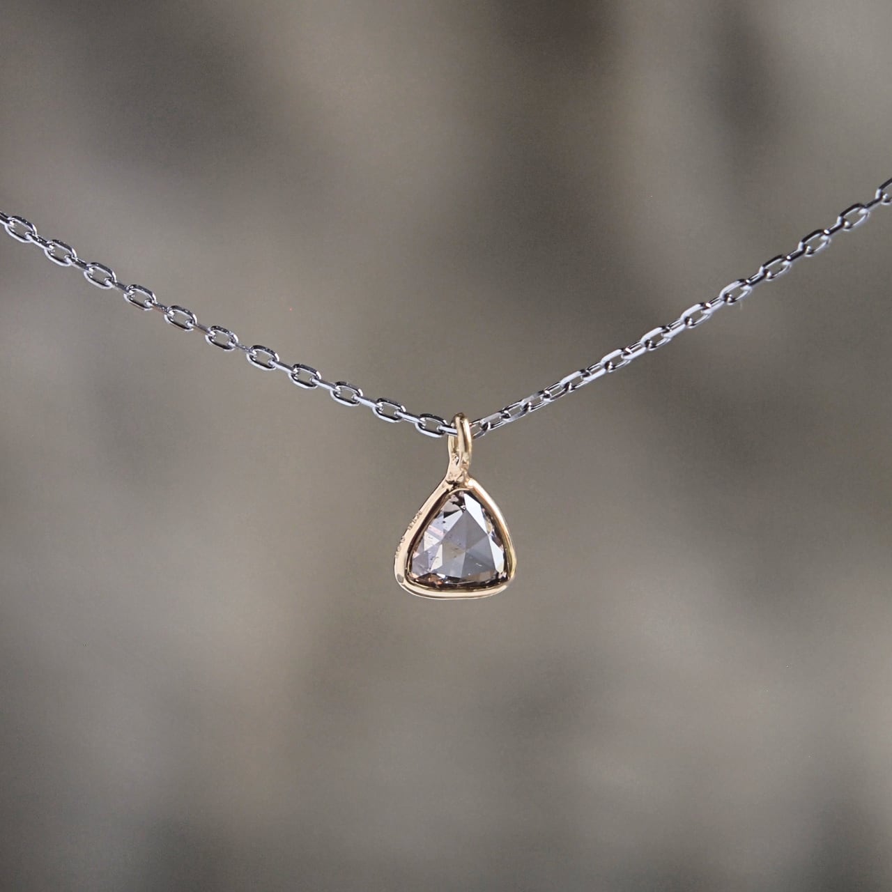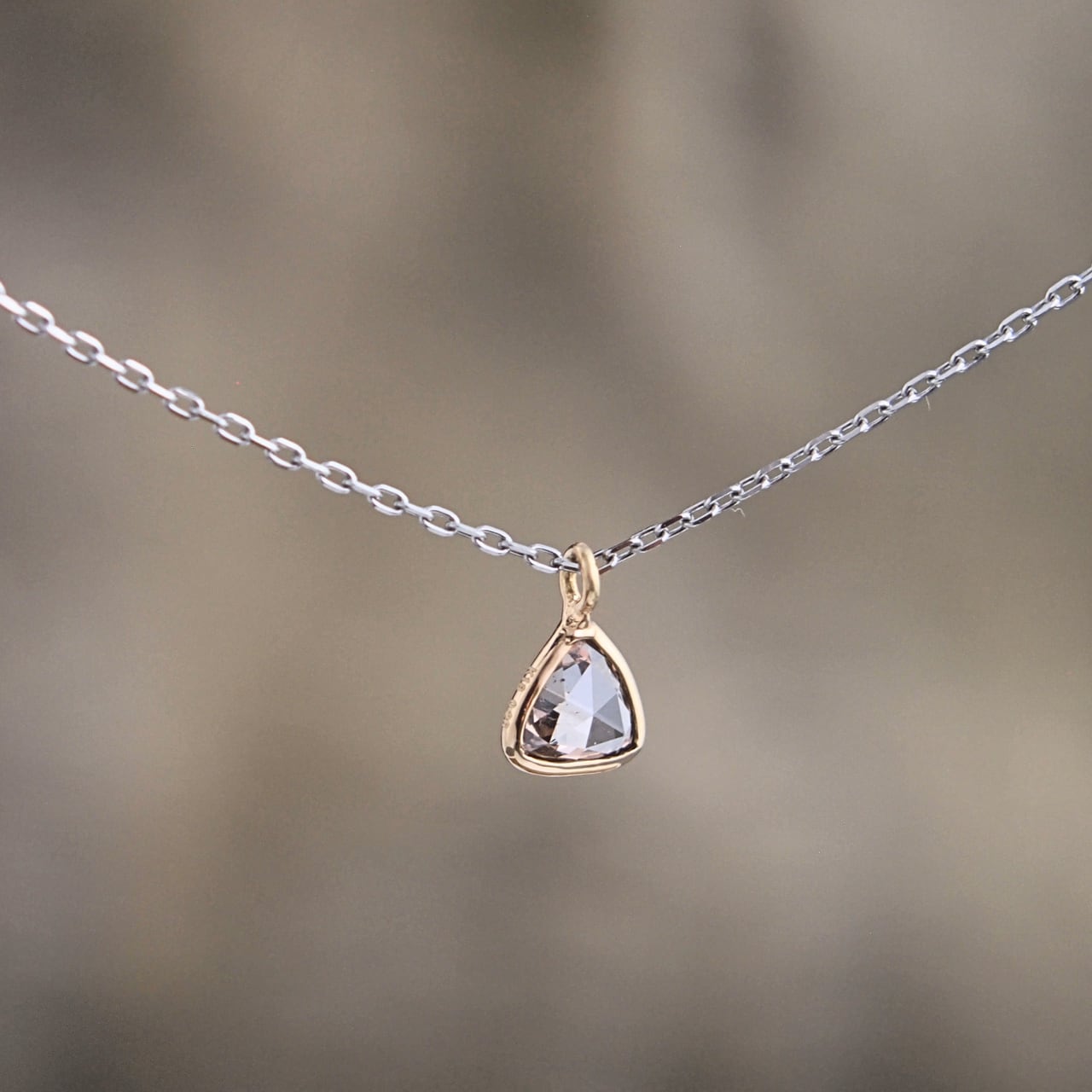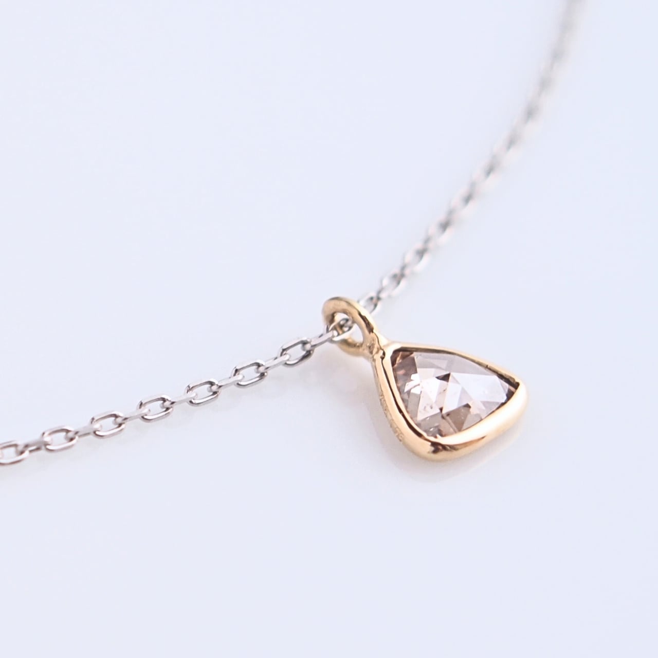 石枠にはK18、ネックチェーンにはプラチナ(Pt850)を使用したコンビカラーが使い勝手の良いネックレス。
