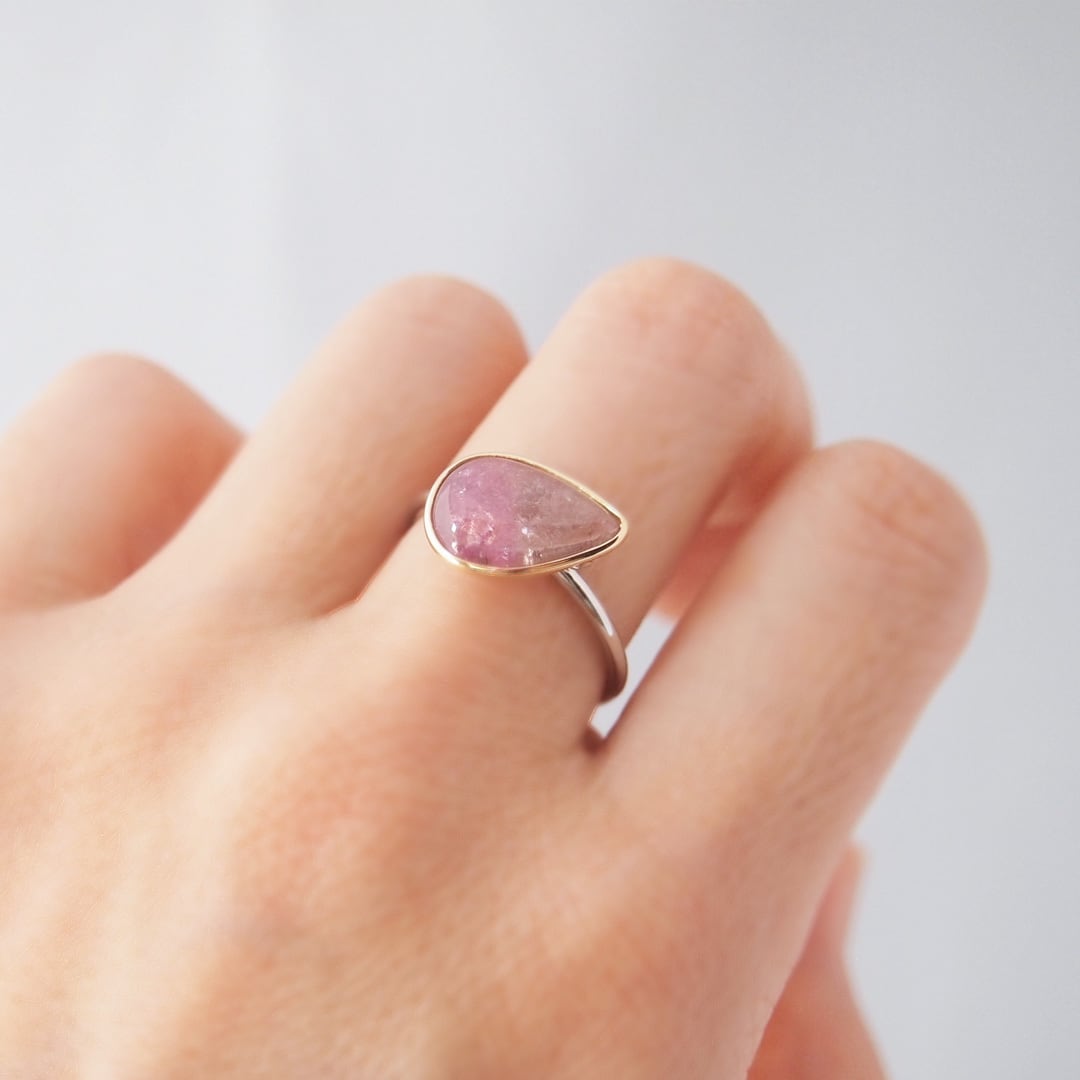 しずく型のトルマリンは少し斜めに配置しており、シンプルながらも一味違うおしゃれなリングとなっています。
